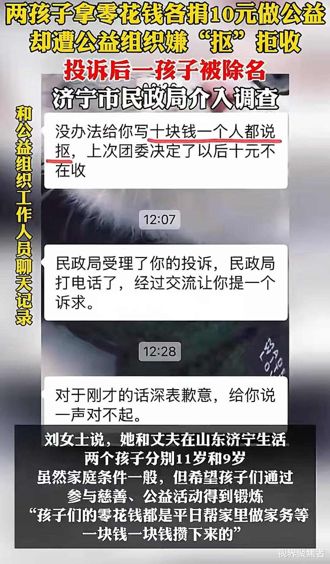 近日,山东济宁发生的一件事,让公益的美好蒙羞。刘女士的两个孩子,分别11岁和9岁,用平日里帮家里做家务攒下的零花钱,各捐