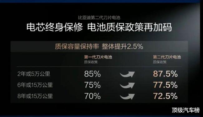怎么证明?相比第一代刀片电池的质保政策,比亚迪直接把二代刀片电池的质保标准提升了2.5个百分点,电芯终身保修。而这,是一种技术绝对自信才敢豪掷的加码政策。