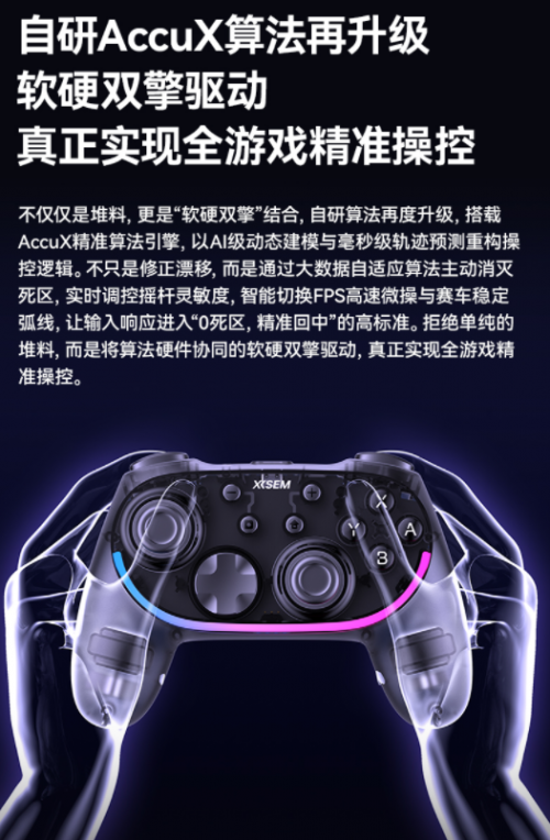 配合全新自研AccuX精准算法引擎,通过AI动态建模主动消灭死区,实现1ms级轨迹预测,无论是FPS游戏的微操压枪,还是赛车游戏的平滑转向,都能做到“指哪打哪”,千万次操作后依旧精准如初。