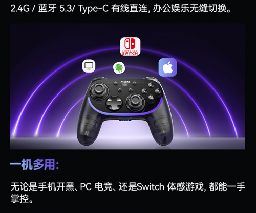 2.4G、蓝牙5.3、Type-C有线三模连接方式,兼顾稳定性与便捷性:蓝牙模式支持远程一键唤醒Switch,2.4G模式10米内零延迟,有线模式满足电竞级稳定需求。无论是手机开黑、PC团战,还是Switch体感游戏,一只手柄就能全程掌控。