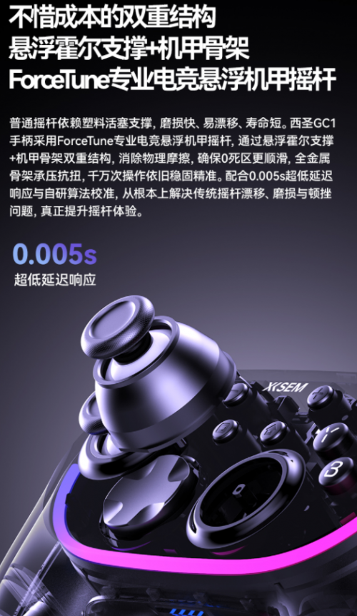 摇杆漂移、磨损快,是多数入门级手柄的“致命伤”——塑料活塞支撑的传统设计,往往用不到3个月就出现操控偏移。西圣GC1直接颠覆这一现状,搭载ForceTune专业电竞悬浮机甲摇杆,创新采用“悬浮霍尔支撑+全金属机甲骨架”双重结构,从根源消除物理摩擦。