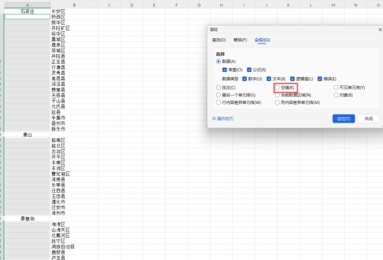 第二步,选中数据区域,按下CTRL+G,定位条件选择空值,确定