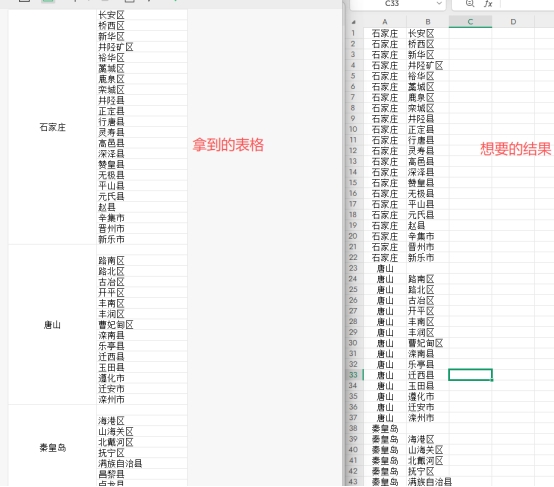 如下图,我们拿到的表格是左侧的样式,但是我们想要的结果是右侧的样式,这时候就可以用定位空值的办法,快速填充