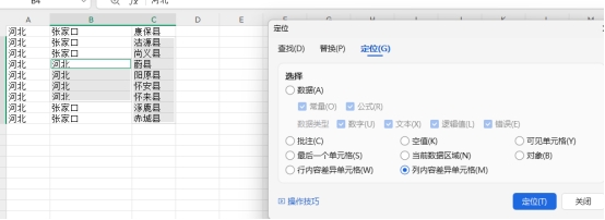 定位是比较该用该列的第一个选中的单元格的值和当前单元格内容对比,如果数据不一致,就加入到定位中。