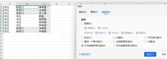 定位是比较该单元格和左侧的单元格数据对对比,如果数据不一致,就加入到定位中