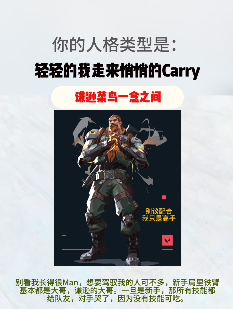 钱包应该是无畏契约里最“著名”的存在,虽然大家都喊瘤子,但是人格魅力这一块,只是跟钱有关仅此而已,有一说一有的钱包确实还挺C。铁臂这个英雄应该是先锋里最难操作之一,其实技能放起来简单,但是想要跟队友衔接就很难!但很多铁臂单排玩起来,是真大哥!