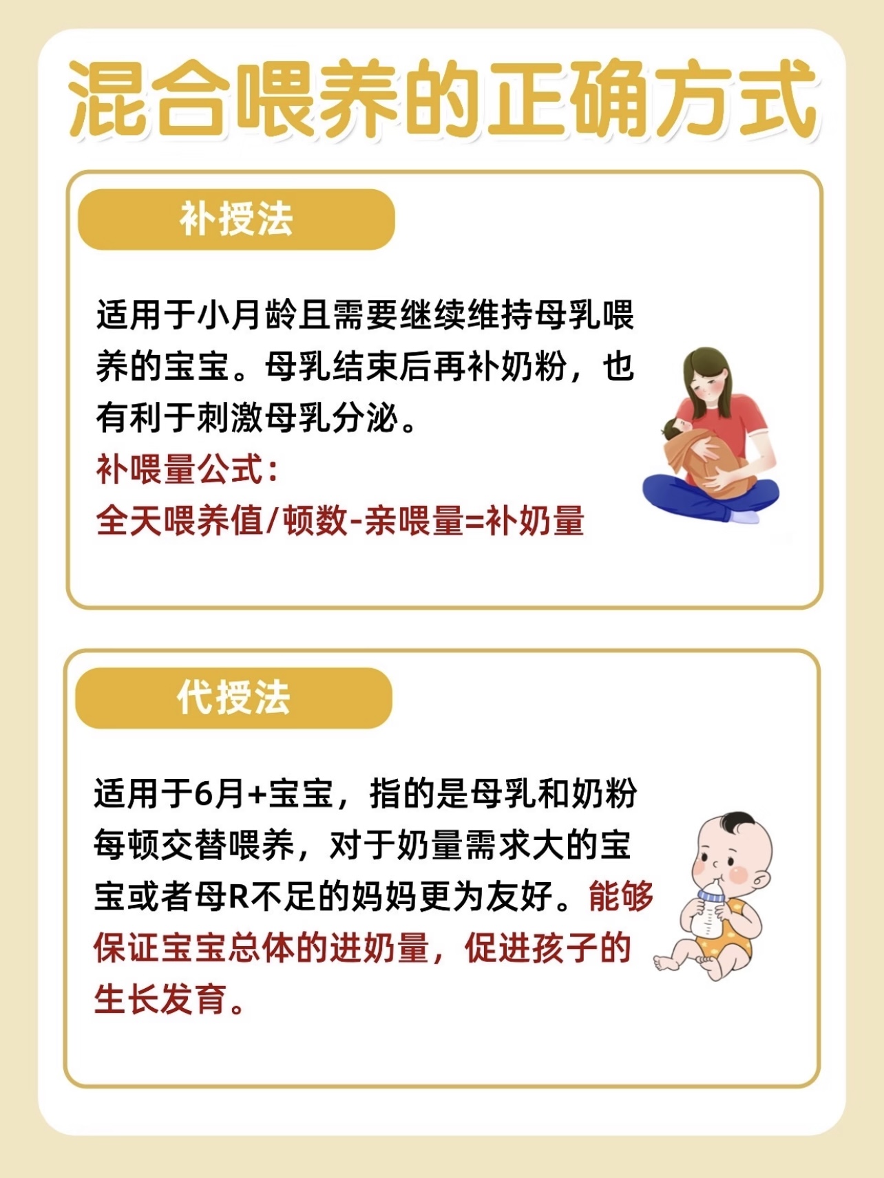 混合喂养的正确方法,有两种方式,补授法:如果妈妈母乳量不太够,但还想尽量多喂母乳,补授法是个不错的选择,每次先让宝宝吸吮妈妈的乳房,刺激乳汁分泌。宝宝吸吮的过程就像给乳房发信号,告诉它“我需要更多奶”,等宝宝吸了一段时间后,再根据宝宝的食量,用配方奶补充不足的部分。比如,宝宝吃母乳后没吃饱,还想吃,这时候就可以用奶瓶喂适量的奶粉。不过要注意,用补授法时,不要一次喂太多奶粉,以免宝宝吃得太饱,对母乳失去兴趣,影响母乳分泌。代授法:要是妈妈因为工作等原因,不能按时给宝宝喂奶,或者母乳量实在太少,代授法就派上用场了,代授法或一次只喂配方奶,交替进行,比如,早上喂母乳,中午喂配方奶,下午再喂母乳,晚上喂配方奶,这种方法可以让妈妈有一定的休息时间,也能保证宝宝摄入足够的营养,但要注意,代授法可能会在一定程度上影响母乳分泌,所以如果妈妈还想继续母乳喂养,在条件允许的情况下,要尽量增加宝宝吸吮母乳的次数。