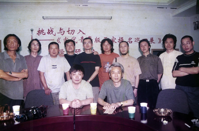 2002年6月国内首次以美术批评家提名方式集体推出版画创作群的展览~《当化青年版画家提名巡回展》在首都师范大学美术馆举行,10位参展的版画家(左起)苏新平、王连敏、贺昆、郑忠、孔国桥、徐宝中、张广慧、王家增、钟㬢、陈琦。