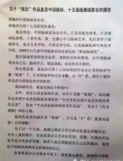 为了讨一个公道,兹通过林抗生馆长转呈组委会两幅作品,并呈上我的报告,祈求组委会以艺术的良知、道德,对我的作品水平是否有参评资格,能否入选全国版展做出公正的裁决。我相信中国版协的神圣及组委会的公正。(下略)