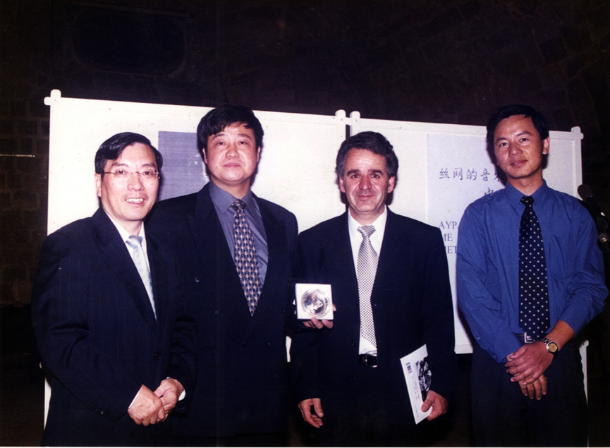 2000年5月经塞中友协的邀请,郑忠个展在塞浦路斯共和国首都尼科西亚法马.古斯塔门博物馆举行。左起:中国驻塞大使宋爱国、郑忠、塞中友协会长迪诺思、副会长蔡伟洲。