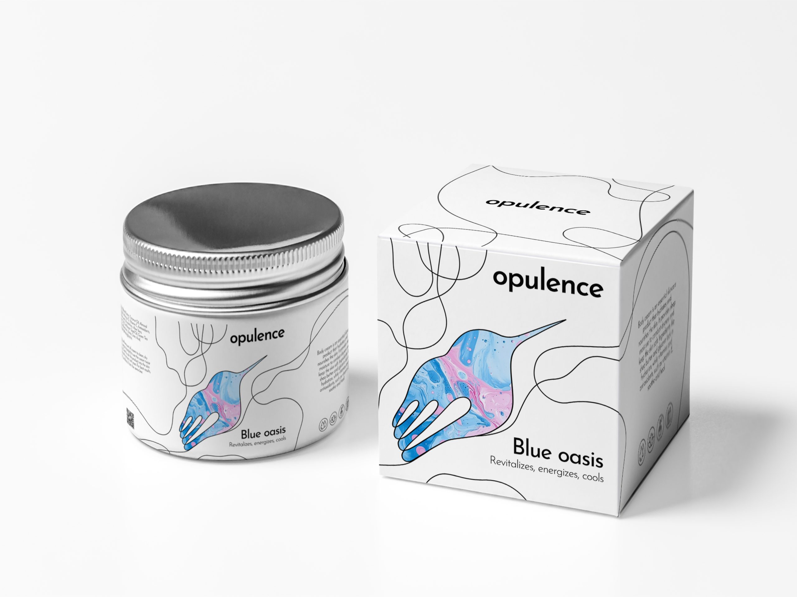 opulence的包装设计则走了一条截然不同的艺术路线。其包装盒以白色为主色调,搭配抽象的蜂鸟图案,给人一种简约而不失高雅的视觉感受。蜂鸟图案采用了独特的色彩融合效果,如“Pink velvet”款中,粉色、紫色等色彩相互交织,仿佛是梦幻般的色彩盛宴;“Blue oasis”和“Green serenity”款同样以独特的色彩搭配,展现出别样的艺术魅力。包装上的文字同样简洁而富有表现力。“opulence”以黑色字体呈现,醒目而具有辨识度。名称如“Pink velvet”“Blue oasis”“Green serenity”等则以不同的字体和颜色突出显示,与图案相得益彰。整体设计通过抽象艺术与简洁文字的完美结合,营造出一种神秘而诱人的氛围,吸引人的目光。