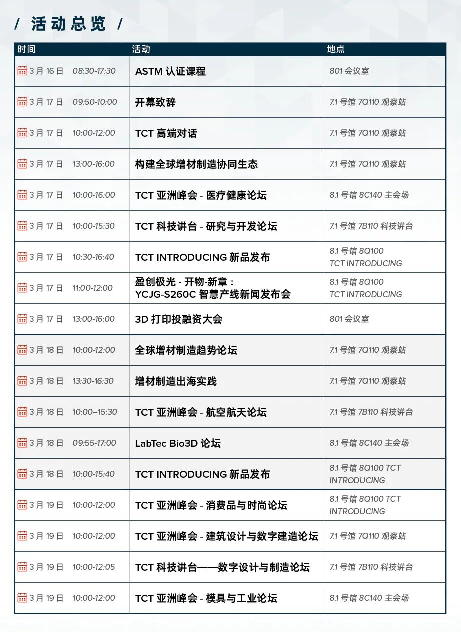 第12届TCT亚洲展将于2026年3月17–19日在国家会展中心(上海)7.1&8.1馆盛大启幕。这里汇聚全球前沿技术与创新成果,贯通设备、材料、软件、应用与服务全产业链,承载亚太制造力量的集中表达,更链接全球3D打印产业的新趋势与新格局。展会信息