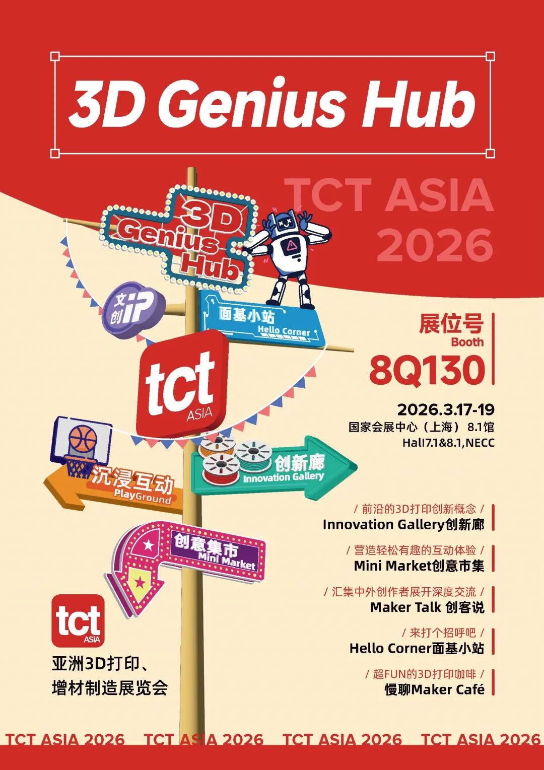 作为行业创新孵化平台,3D Genius Hub在2026年TCT亚洲展迎来全面迭代。它不再只是展示空间,而是一个“共同创造”的活动场域。