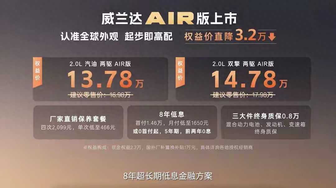 价格诚意,是撬动市场的核心支点。威兰达AIR版以直降3.2万的力度,将2.0L汽油版定价压至13.78万,混动版仅14.78万,突破合资中型SUV价格底线。相较于同级竞品,它摒弃品牌溢价,把实惠直接让渡给用户,让普通家庭以亲民预算,拥有全球品质SUV。8年超长低息金融方案,首付1.46万起、月供1650元,进一步降低拥车门槛,实现“轻松购车、无压用车”,真正做到以用户为中心。