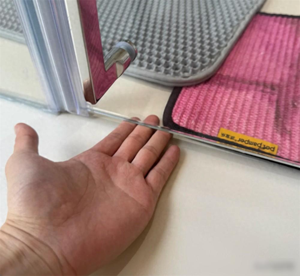 玻璃门做隔断确实聪明。固定玻璃加平开门的设计不占地方。开关灵活不说,平时还能随时观察猫主子状态。底下特意留一指缝换气,这细节到位了。不像有的全封闭猫屋,关上门就闷得慌。