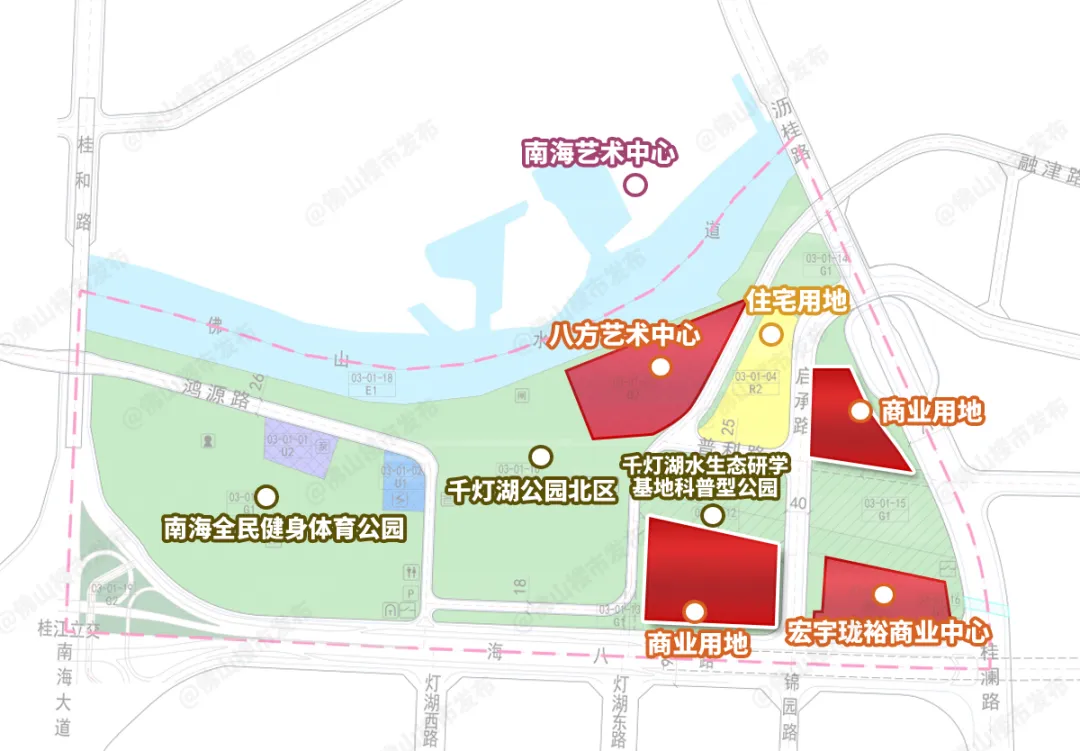 从该效果图可以看出,项目具体位置就在千灯湖中轴八方艺术中心附近区域,紧邻沥桂路。再来看看片区最新调整的控规图,会发现周边目前仍有两宗待开发商业用地。