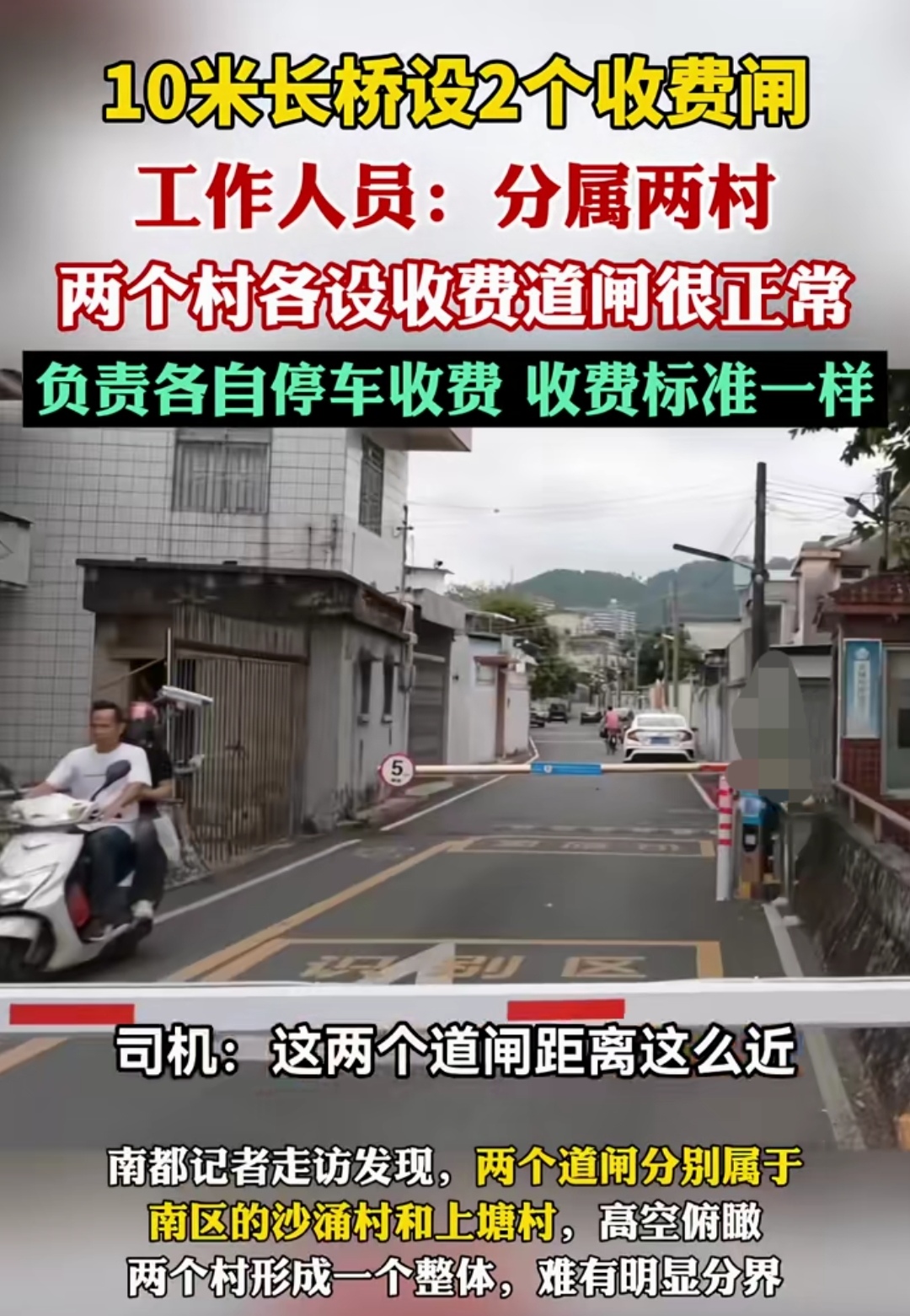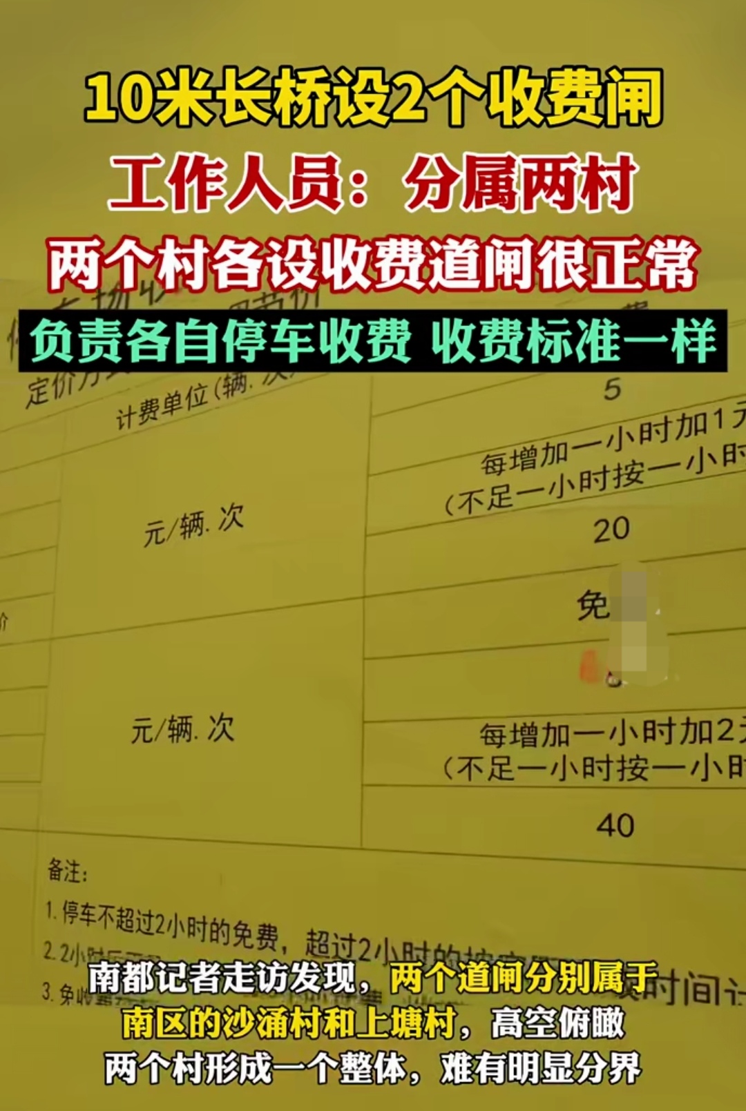 面对大家的质疑,当地工作人员给出了官方解释:这两个道闸其实分属南区街道的两个相邻村落——沙涌村和上塘村。由于两村地界相连,甚至在物理空间上已经连成了一片,为了区分各自的辖区,两村才各设一道收费闸,负责本村范围内的停车管理,且收费标准一致。