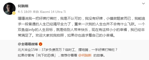 但后来,他们选择了截然不同的路。全嘻嘻回归到主流生活,在职场拼杀内卷,目前是有相当知名度的高学历网红。而何脑斯一直走在文艺的路上,目前是全职摄影师。