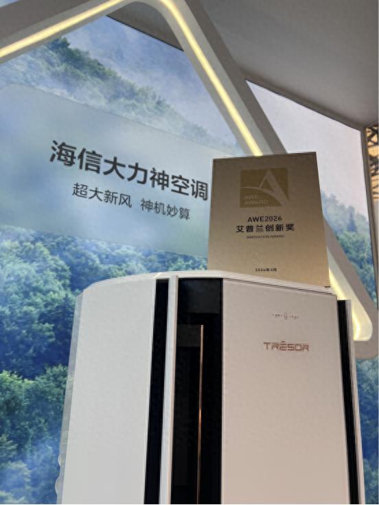 3月12日,2026中国家电及消费电子博览会(AWE2026)在上海正式开幕,开展首日,代表行业至高荣誉的AWE艾普兰奖重磅公布。海信大力神空调U6凭借SLP星闪人感2.0、新风主动管理、好空气管家等多项原创技术突破,成功摘得艾普兰奖“创新奖”,这款2026美加墨世界杯定制空调,凭借硬核实力成为本届展会空调品类的明星产品。