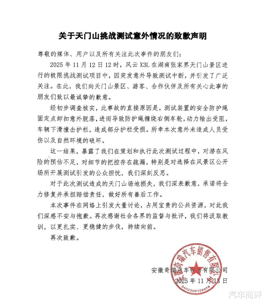 11月12日中午,奇瑞风云X3L在湖南张家界天门山景区进行的极限挑战测试项目中,因突发意外导致测试中断,由此也引发了各界的广泛关注。该事件在网上迅速发酵,有人说奇瑞是在东施效颦,有人说是车性能不行,也有人说是没活硬整。那么真实情况是否如网上所说一样?咱们不妨客观理性的来分析一波。