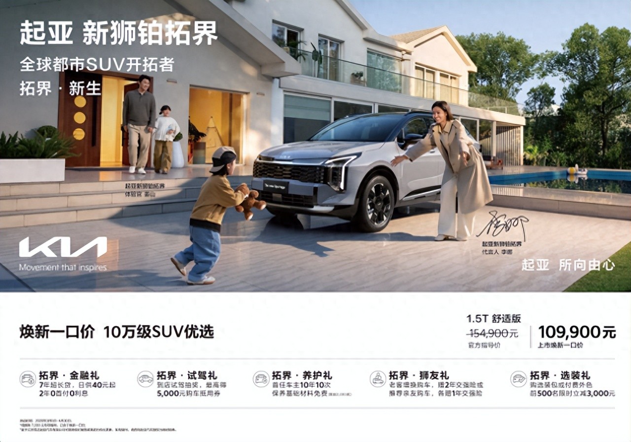 2026年3月5日,起亚新狮铂拓界正式上市,共推出7款车型,并在中国首次提供X-Line专属运动设计包,官方指导价15.49万元-21.79万元。为回馈广大中国用户的信赖,即日起至4月30日,消费者购车即享全国统一“焕新一口价”10.99万元起!同时还可享金融礼、试驾礼、养护礼、狮友礼、选装礼5大尊享礼遇。