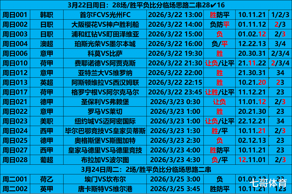 22赛事前瞻复盘28✔16;休息了一天,今天就两场比赛,大家参考参考,结果如何勿怪。继续努力,给大家带来更精准的赛事思路,是我们的宗旨。
