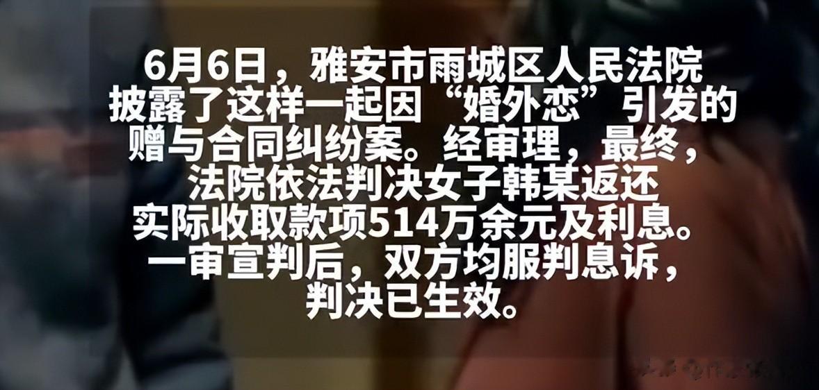 2025年6月,法院最终判定,王先森对韩某女的赠与违反了法律规定,也有悖于公序良俗,应予以返还。最终,韩某女只好把王先森对自己的赠与悉数返还。