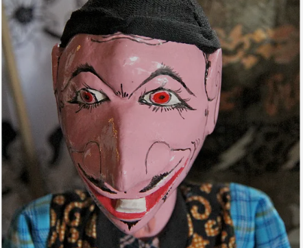 它的脸颊涂着两团大红色的颜料,同样用大红色颜料涂的嘴巴,竟然往两边翘起,露出了一个诡异的笑容。