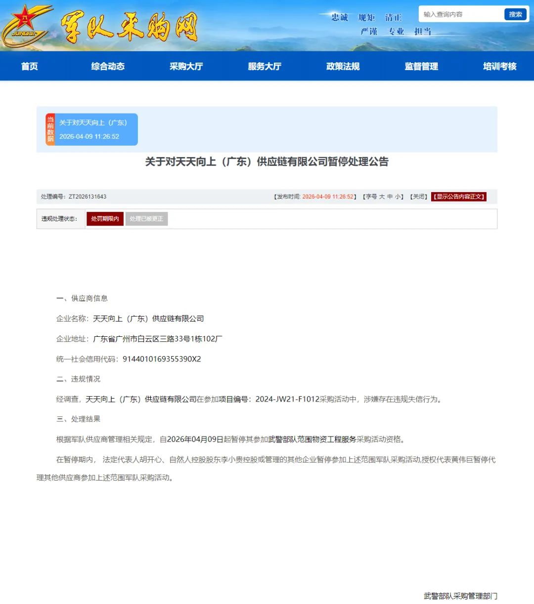 4月9日,军队采购网发布《关于对天天向上(广东)供应链有限公司暂停处理公告》(ZT2026131643)。
