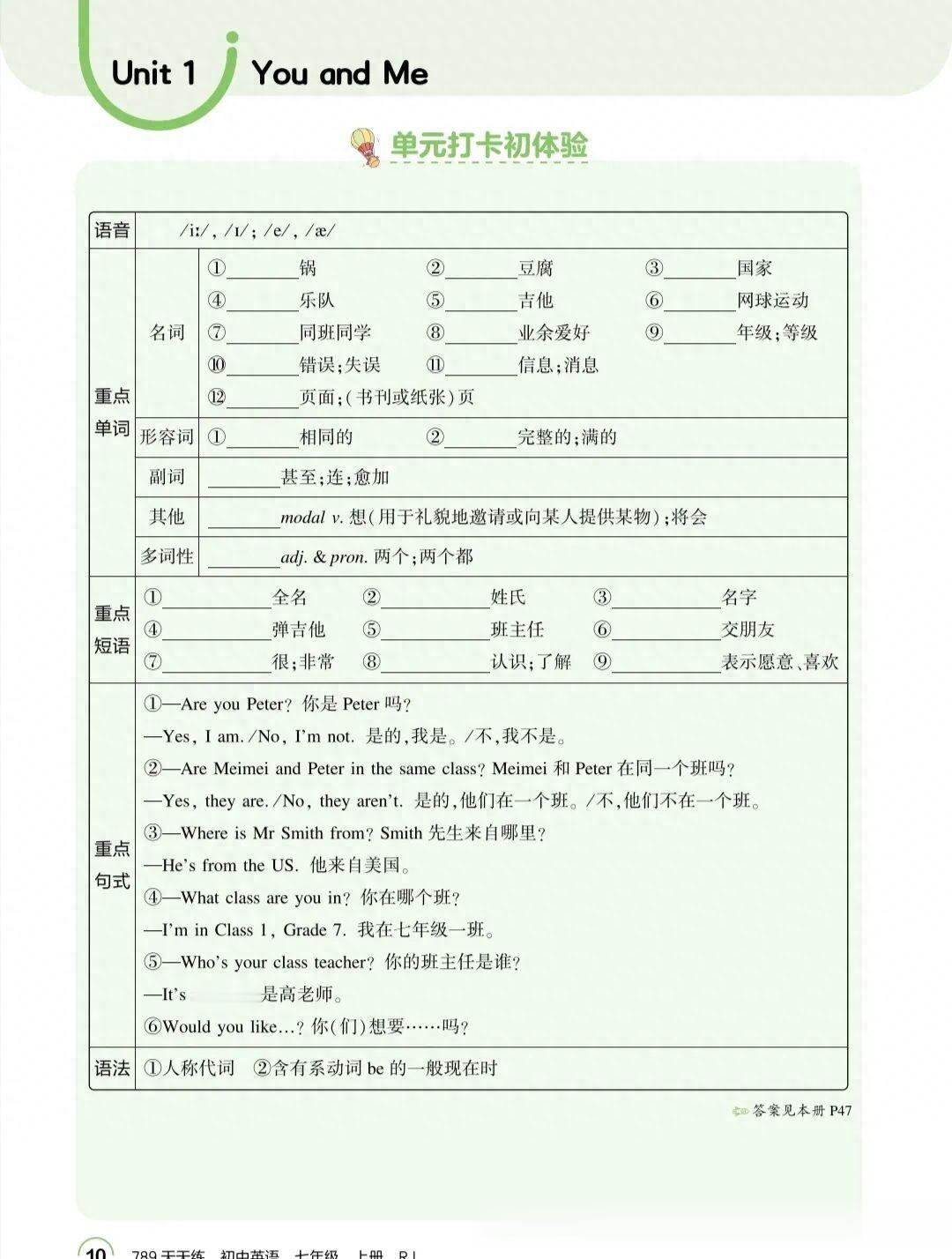 人教版七年级英语上册 Unit 1 You。and Me是整个初中英语的起始单元,其核心目标是让学生学会自我介绍和结交新朋友。知识点基础但至关重要,是后续学习的基石。