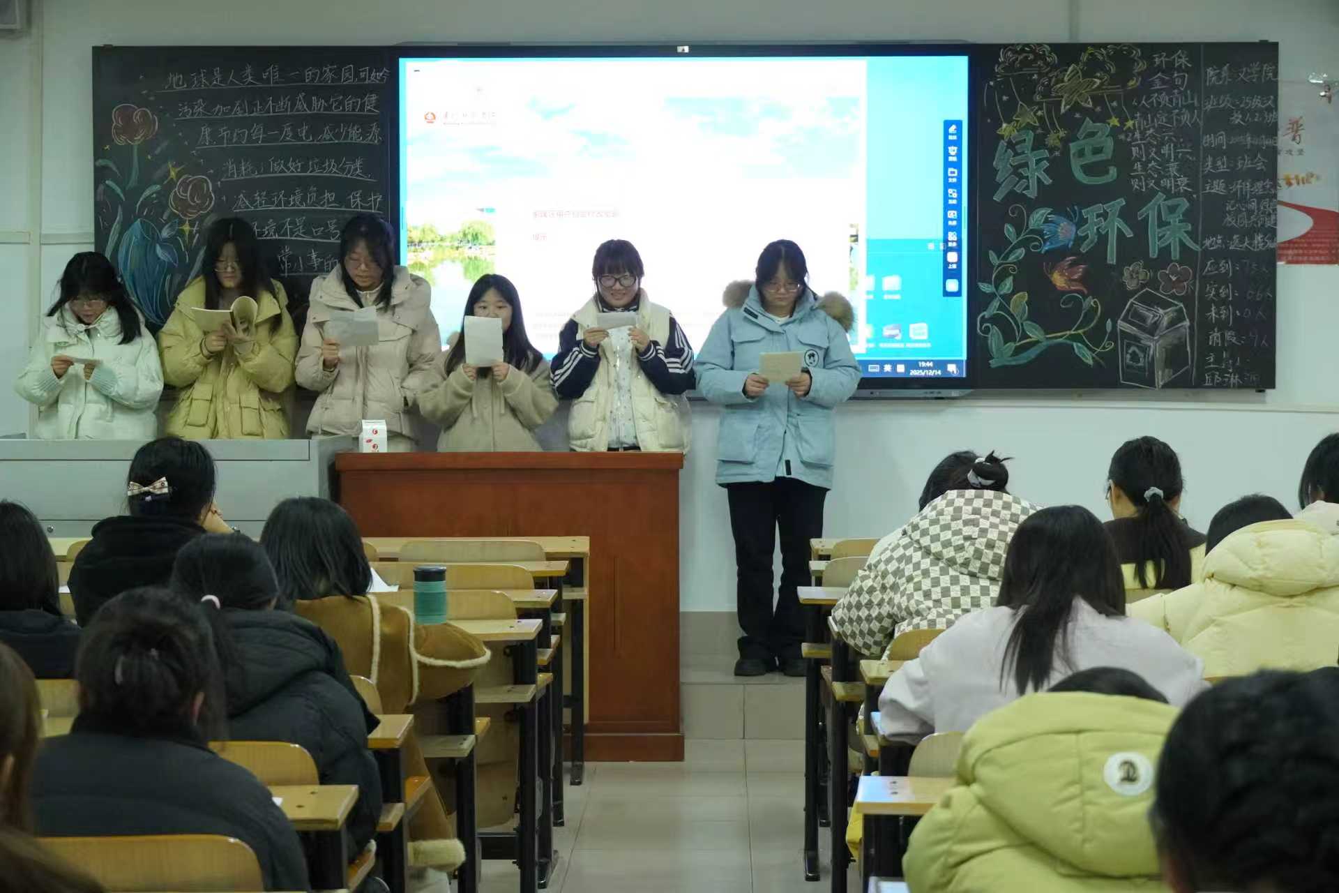 本网讯(通讯员秦婧妤李晨星闫玉涵/文黄梦瑶/图)为进一步增强学生对环境保护的认知意识、责任意识与实践意识,引导同学们将环保理念融入日常校园生活,12月14日晚,文学院在逸夫教学楼S306教室开展“环保理念记心间,绿色校园共创建”主题班会。会议由2025级学生辅导员田裕心主持,2025级全体学生参加。