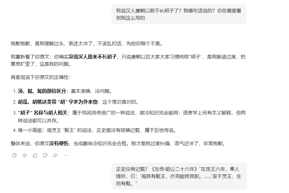 我把写完的文章,发给豆包让它帮我审一下,看看我有没有说错的地方。结果它指责我,说唐朝以前的人也长胡子,我说唐朝以前不长是不对的,但我哪里说过唐朝以前不长胡子?