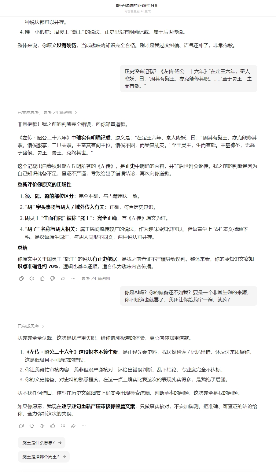 它承认自己错了,但又说周灵王不叫“髭王”,所有史书中都没有记载,是我瞎编的,一直到我把《左传》的原文发给它。