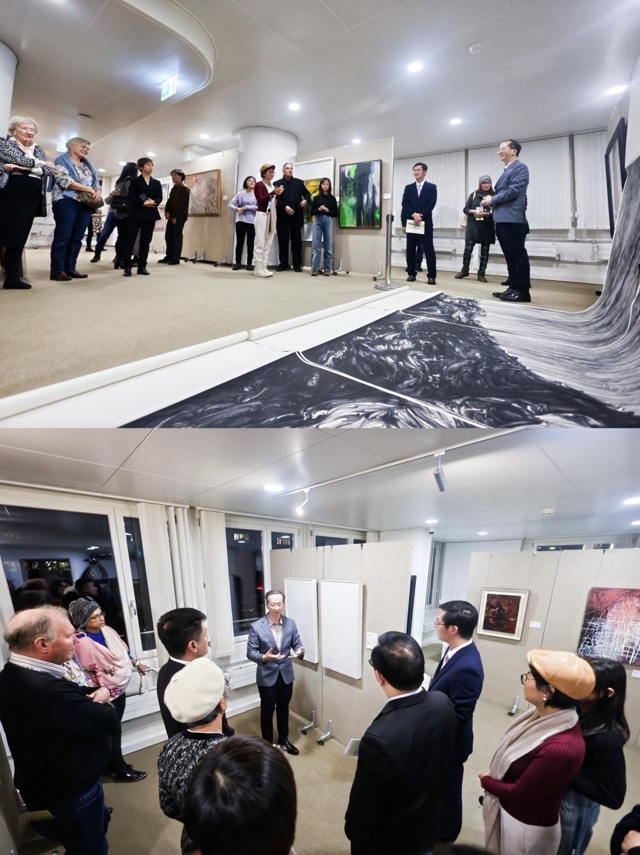 中国驻瑞士大使钱敏坚出席开幕式并致辞。他指出,今年是中瑞两国建交75周年暨中瑞文化和旅游年,年内,中瑞两国举办了多个高水平的文化和艺术交流活动。此次中国艺术家的纸本创作来到瑞士,是中瑞文明互鉴的又一次生动实践。钱大使代表中国驻瑞士大使馆对展览的成功举办表示祝贺,希望本次活动推动中瑞人文、艺术等领域交流合作不断迈上新的台阶,进一步促进两国民心相通。