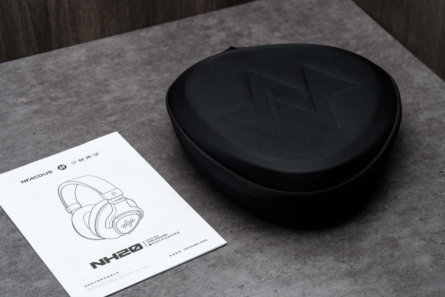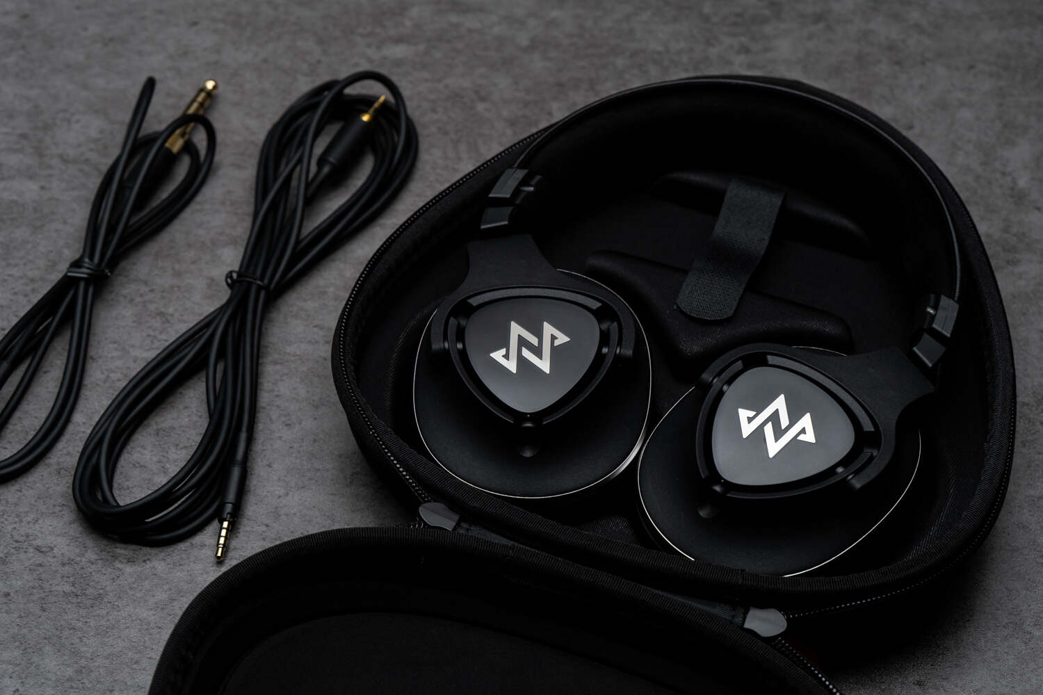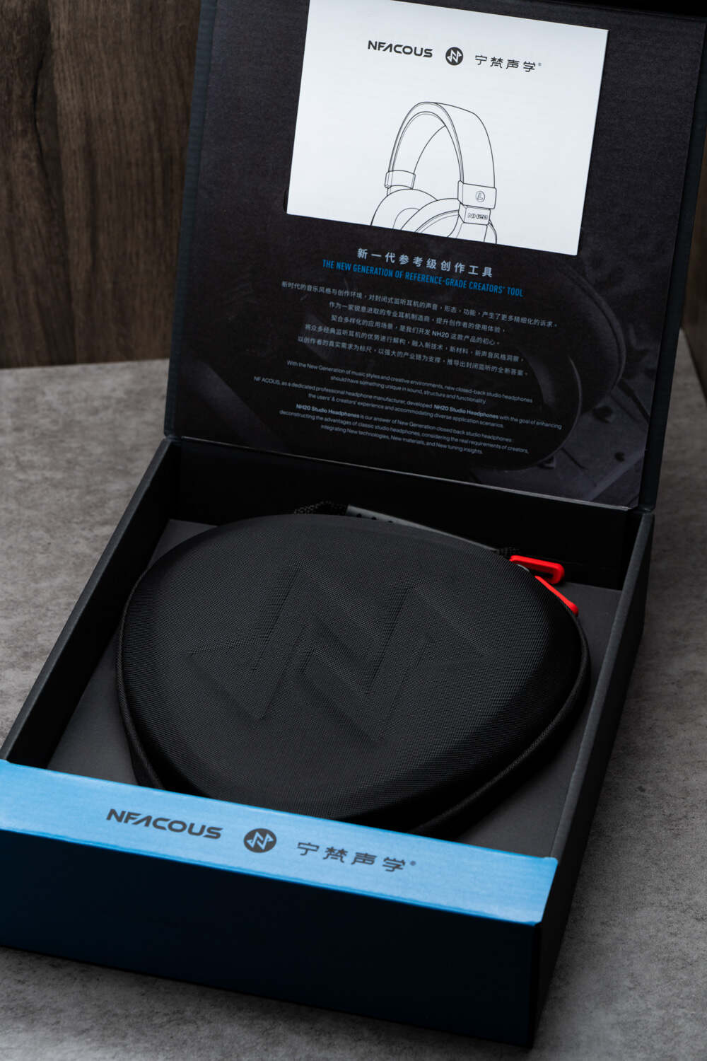 NH20作为一个监听耳机品牌的首款封闭式头戴监听产品,从外到内的专业范儿必须给足,黑蓝配色的扁平包装很有气势,开启后首先是标配的黑色弹道尼龙耳机收纳包,这个包的质感和做工非常出色,硬质结构抗压耐用,内部设计也很合理。宁梵的“拨片”形设计元素贯穿了NH20的方方面面,就连这个收纳包也是拨片形的轮廓——但不管像啥,好看是关键。NH20标配有两条单端线材(1.2米和3米),附送了3.5转6.35插头,可用于接驳各类专业设备。