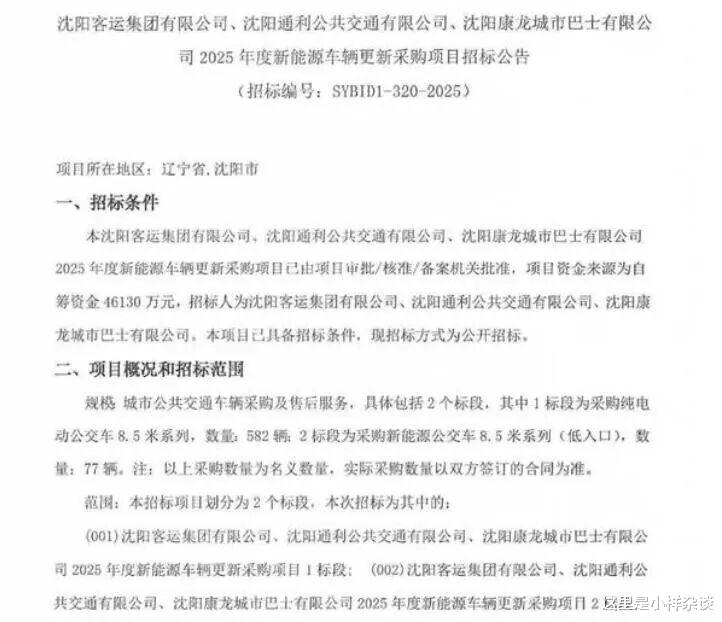 582+77(低入口),一共659辆,这次是沈阳客运集团采购,这些车辆会分给旗下通利公共交通、康龙城市巴士那些公司的线路。没想到这一天来得这么快,更多的8.5米小车要来了,无论你适不适应,它都来了,客流小的线路影响不大,像现在某些3开头那样客流大的线路换成这样的小车,乘客的舒适感要下降很多了。现在换成8.5米小车的某些线路,已经让曾经的忠实乘客宁愿浪费时间也换其他方式了。其实呀,现在还是有一些线路的乘客很多的,这些客流较大的线路也采用这种8.5米的小车,真的不太够用,不减少车隔的话,真的不太够用,只会把一些乘客赶走,这种8.5米小车载客量下降很多,直接一站就差不多装满了,真的挤不上去。