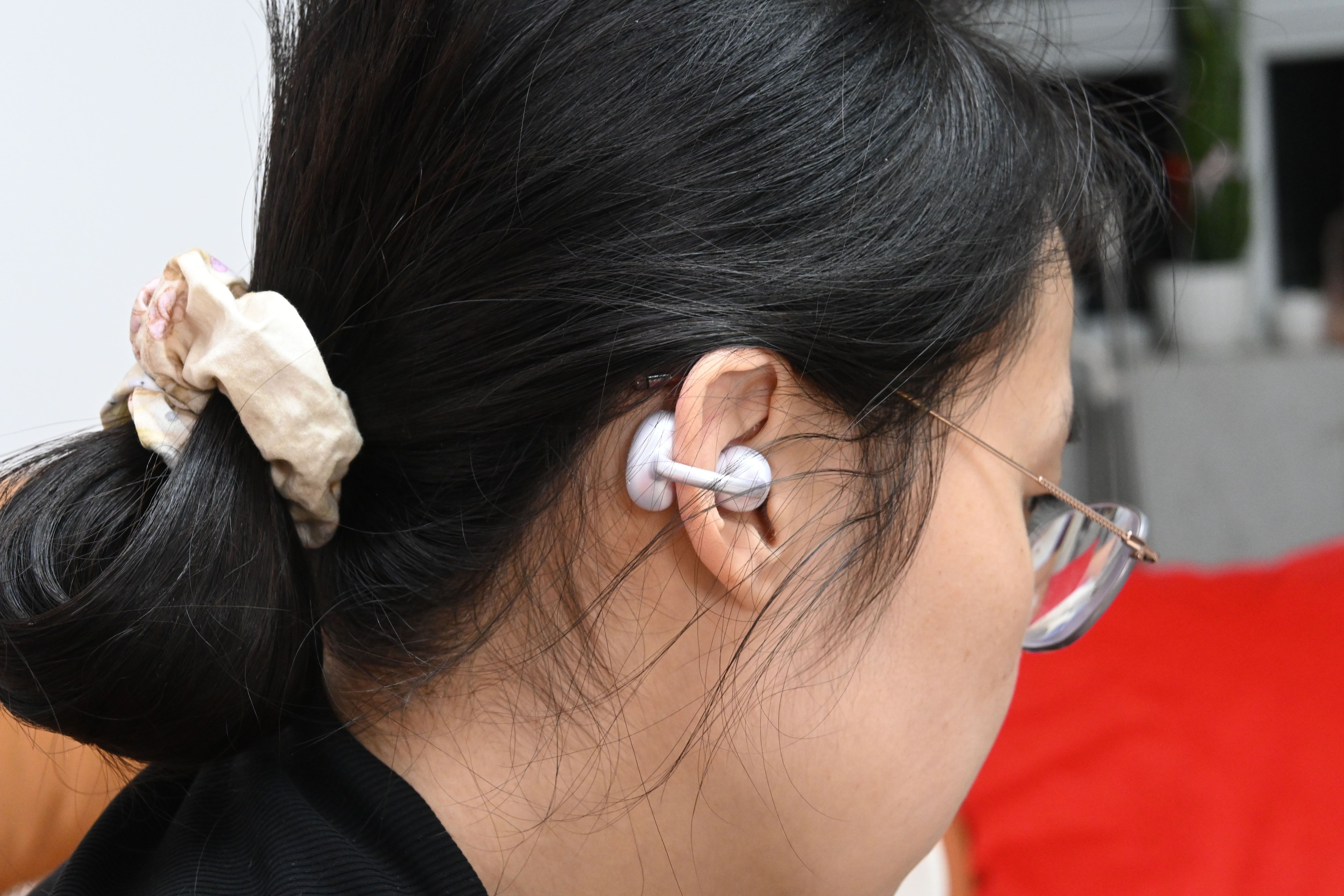 佩戴感绝对是它的核心加分项,也是最颠覆我认知的地方。耳机内侧的“纳米级微气囊矩阵”初看像营销噱头,实际戴上才发现玄机:传统耳夹靠硬夹力固定,压力集中在耳骨上,而这层气囊能把点压力分散成面支撑,触感就像耳机“浮”在耳朵上,而非“夹”在上面。