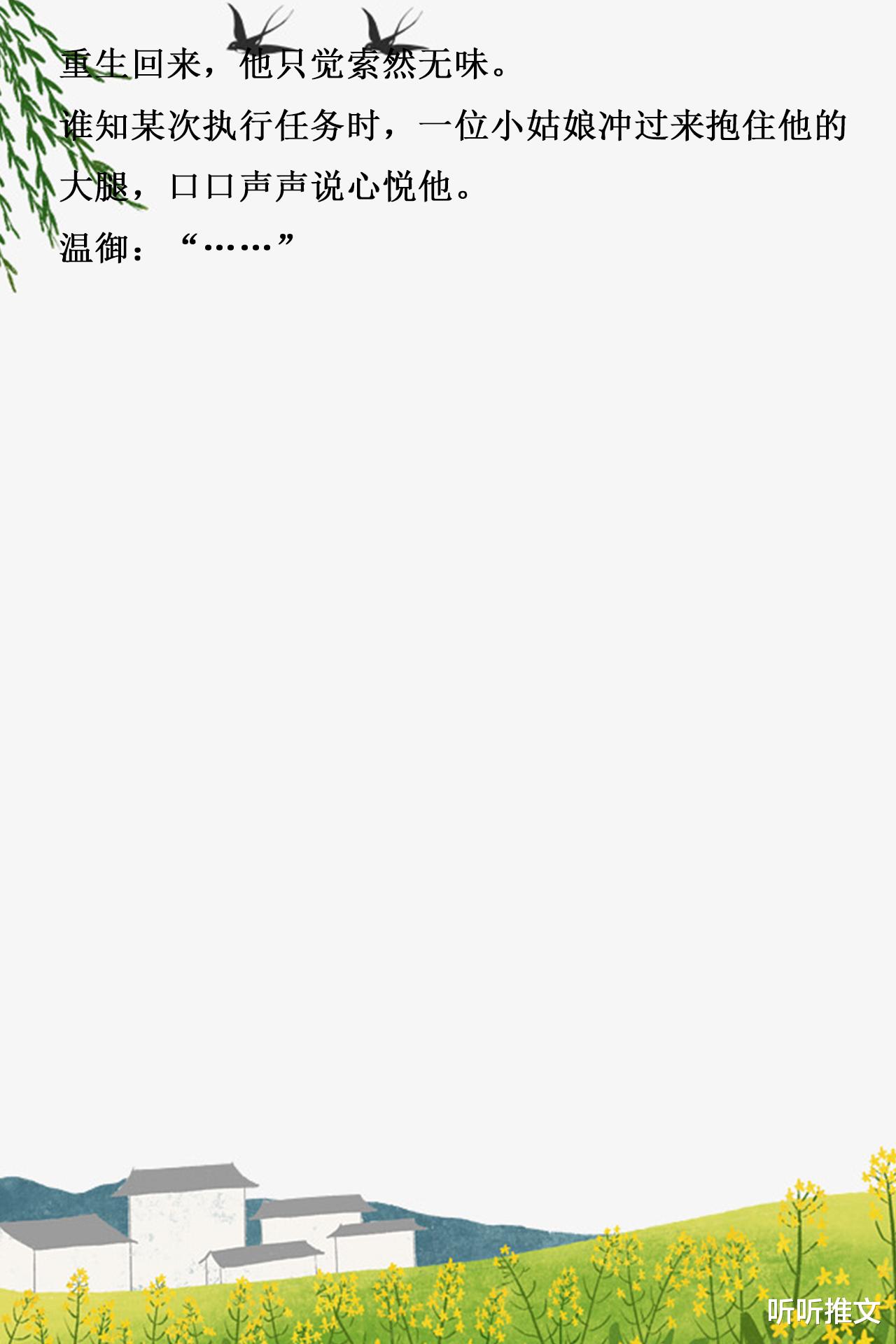 书评:叶娉意外穿成小官之女,还没来得及庆幸,她发现自己是穿书了,还穿成了一个恶毒女配的小跟班,是炮灰中的炮灰。为了摆脱剧情,她情急之下抱上了书中女主哥哥的大腿,并对他深情表白。于是,她走上了每天装深情的道路。原以为就这么糊弄过去,没成想温御却当了真。故事基调轻松有趣,节奏明快紧凑,剧情张力十足,女主聪明善良,跳脱剧情之外,获得了良缘,人物塑造有血有肉,整篇故事读起来让人眼前一亮,轻松一读。