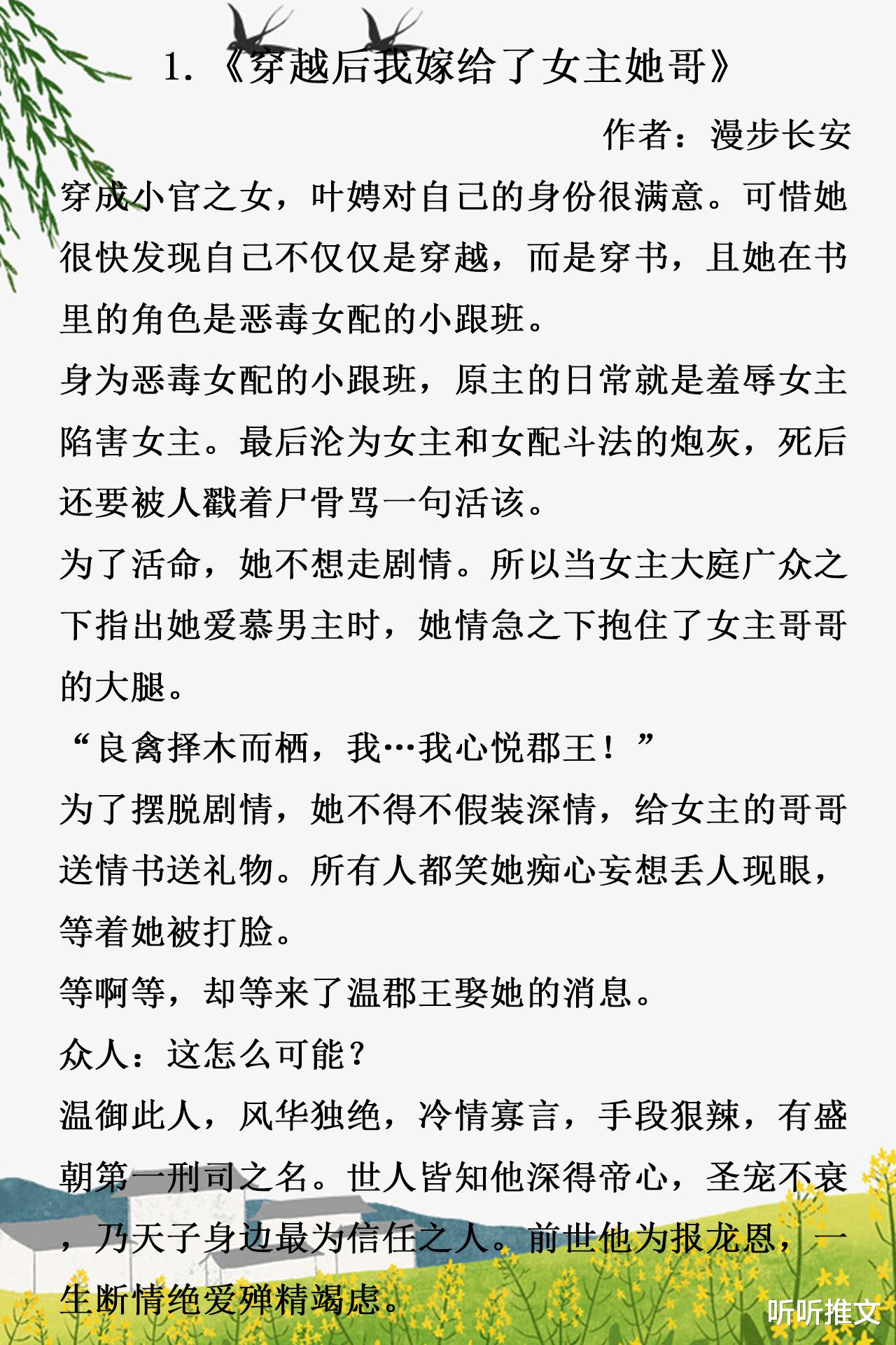 1.《穿越后我嫁给了女主她哥》作者:漫步长安