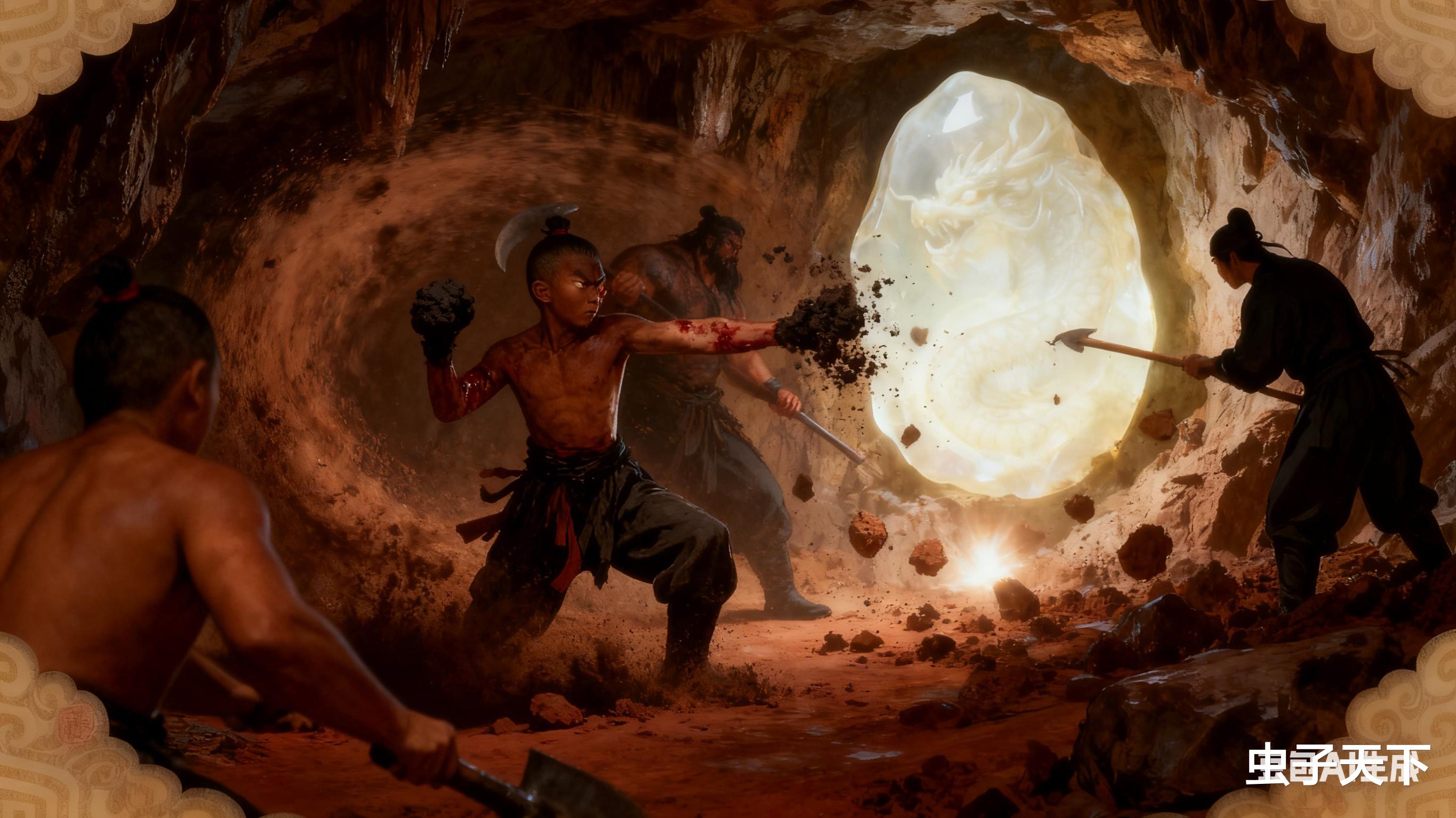 张奎比土行孙高壮不少,手里拿着把月牙铲,身后跟着几个黑衣打手,正对着一块发光的玉石猛挖。