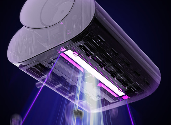 希亦V1在机身设计和深层清洁功能上同样非常考究。它搭载UVC深紫外高能光源(3535高稳定封装,额定功率5–8mW),通过定向反射与聚焦光路,将紫外能量精准集中于除螨核心路径。在高速拍打“翻动—松解—抛离”床品纤维的同时,同步照射释放的螨虫与微生物,实现高密度覆盖的深层抑菌效果,杀菌率高达99.99%,远超传统单灯紫外线除螨仪。