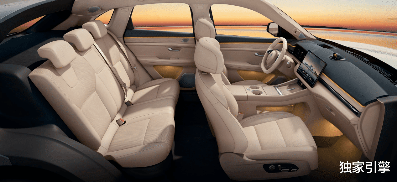 坐进车内,零跑D19的内饰设计同样令人眼前一亮,用料相当扎实,采用了大量的皮质进行包裹加上木纹饰板,豪华感十足。中控台布局简洁大方,超大尺寸的中控屏搭配全液晶仪表和副驾娱乐屏,三屏联动,科技感十足。
