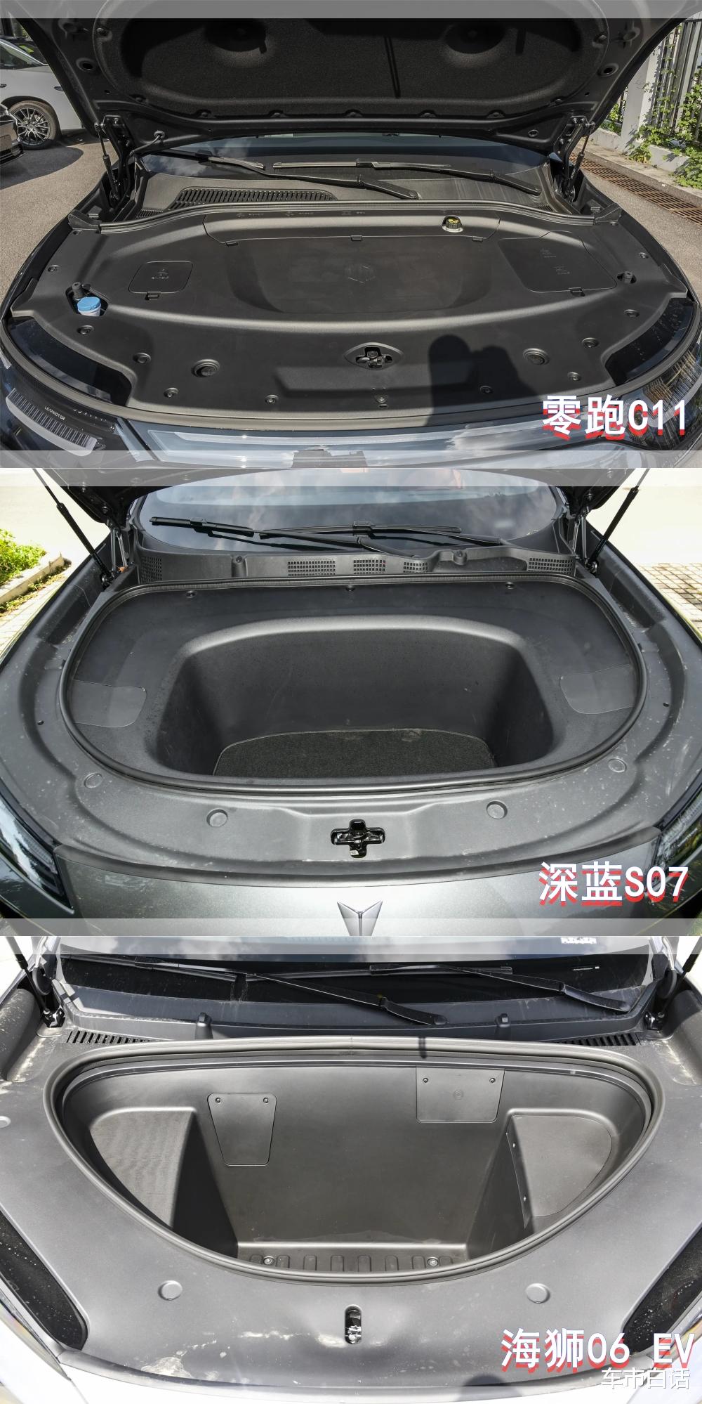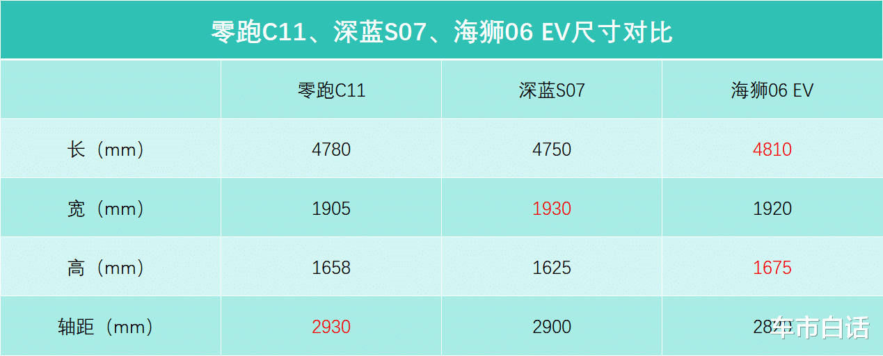 家用SUV首先得考虑空间,从尺寸来看,零跑C11和深蓝S07车长超过4米7,海狮06 EV是4米8出头。轴距层面,零跑C11和深蓝S07都是2米9的水平,但海狮06 EV只有2米82,换句话说,海狮06 EV车长是三台车中最长的,但轴距却是最短的。所以,在轴长比的表现上,零跑C11和深蓝S07具备明显优势,也能带来更大的乘员舱空间。当然,海狮06 EV的尺寸也摆在那,内部空间其实也够用。但如果咱们是五口之家,后排经常满载,那零跑C11和深蓝S07就会更舒服一些。