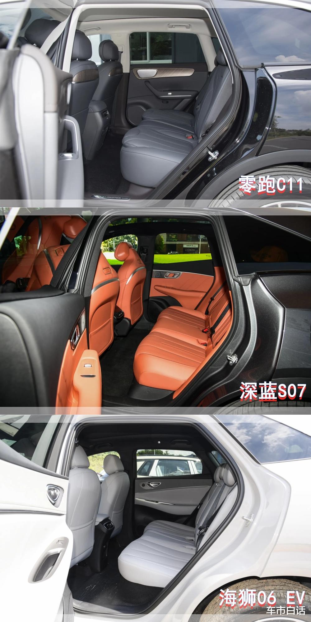 座椅功能上,三台车的前排都给到了加热、通风功能,但零跑C11高配多出了按摩功能,深蓝S07副驾也具备按摩功能,如果咱们长时间开车,座椅按摩还是可以缓解背部的疲劳。后排部分,零跑C11高配还给到了加热、通风功能,能够保证冬暖夏凉,这一点确实值得给好评,这也是深蓝S07和海狮06 EV不具备的功能。