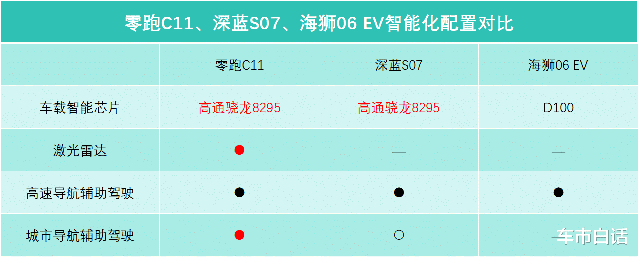 对于当下的汽车而言,智能化也是关键环节。智能座舱部分,零跑C11和深蓝S07都采用了高通8295芯片,这也属于是行业内的旗舰级芯片,算力很强大,由此也能带来更流畅的车机,包括咱们开启车载APP,或者滑动屏幕时,车机响应会更快。海狮06 EV采用的是D100芯片,算力其实也不赖,虽低于8295芯片,但也高于8155芯片,属于行业中上游水准,日常使用也没什么问题。