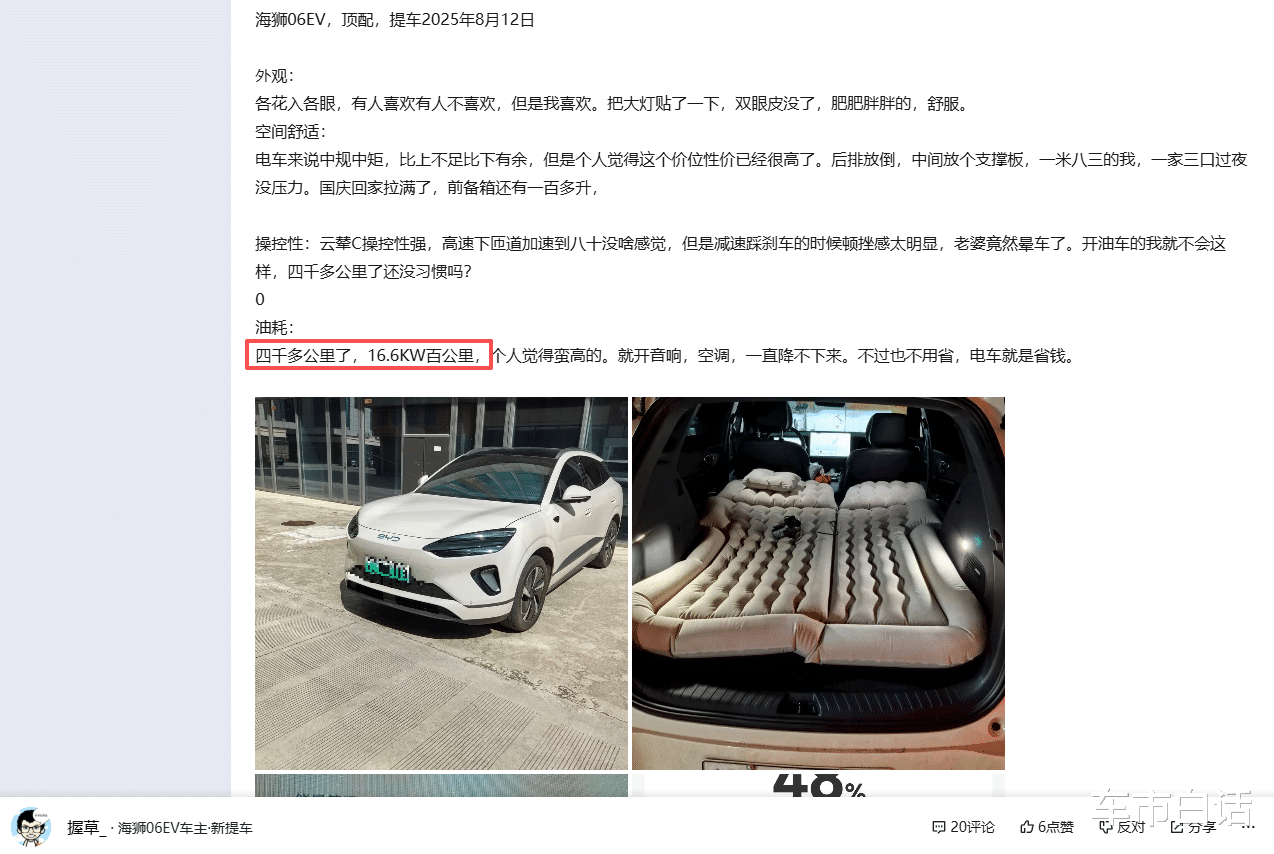 海狮06 EV的口碑也还算不错,用户的实际电耗,大概在12.5-16.6kWh/100km,部分用户还提供海狮06 EV空间不错、操控性好,整体属于是中好评。