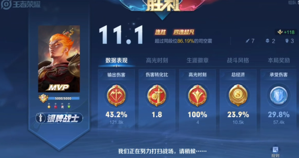 在打完这波后,琴酒的经济直接成为队伍内的一号位经济,而后琴酒带领队友不断开节奏,成功将优势扩大。十分钟双方爆发最后一波团战,琴酒进场后宛如毁天灭地,超高爆发将对面C位尽数融化,而后我方队友卡住亚瑟王位置,帮助琴酒再拿三杀。