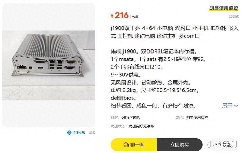 现在新硬盘动不动就五六百,NAS整机更是轻松上千。在这种行情下,很多人就瞄上了再二手鱼上捡漏。我刷到这款其实成色一般、有划痕,但功能完好、无维修,关键配置还很能打:双I210千兆网卡、双COM口、msata+2.5寸硬盘位、9-30V宽压供电,还是无风扇被动散热,安静又省电。