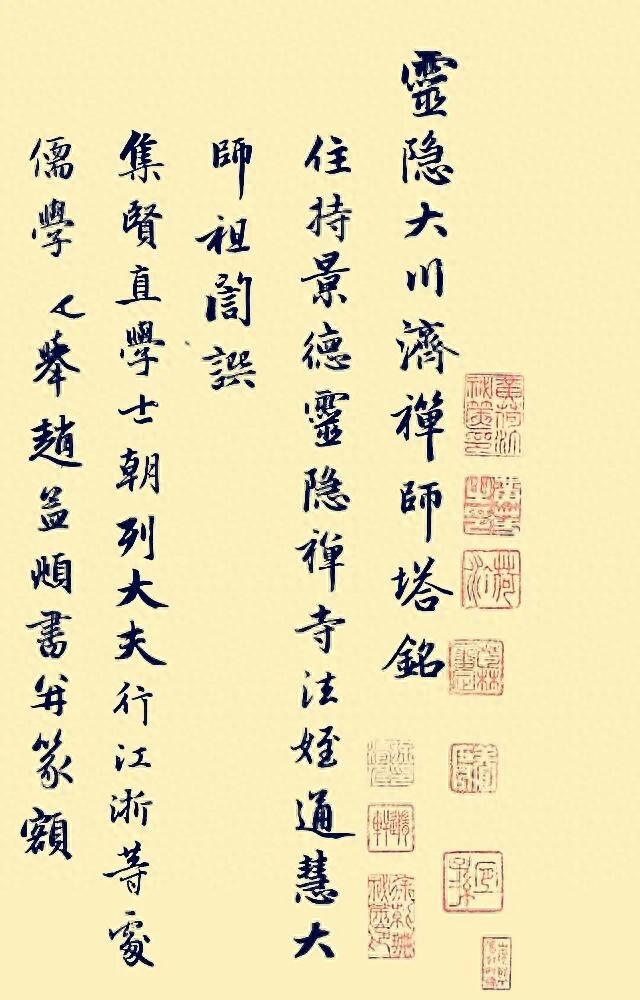 赵孟頫行书《灵隐大川济禅师塔铭》,是其五十四岁神来之笔,被誉为“禅家兰亭,赵体极则”。全篇千八百言,笔笔如珠玉落盘,字字若鸾凤和鸣。笔法中锋圆劲,侧锋灵动,藏露相济,方圆共生,似绵里裹铁,外柔内刚;结体宽绰舒展,中宫紧敛,端庄中见灵动,严谨里含洒脱,无一笔懈怠,无一字失势。虽少牵丝缠绕,却笔断意连,如行云贯空,气韵通篇。