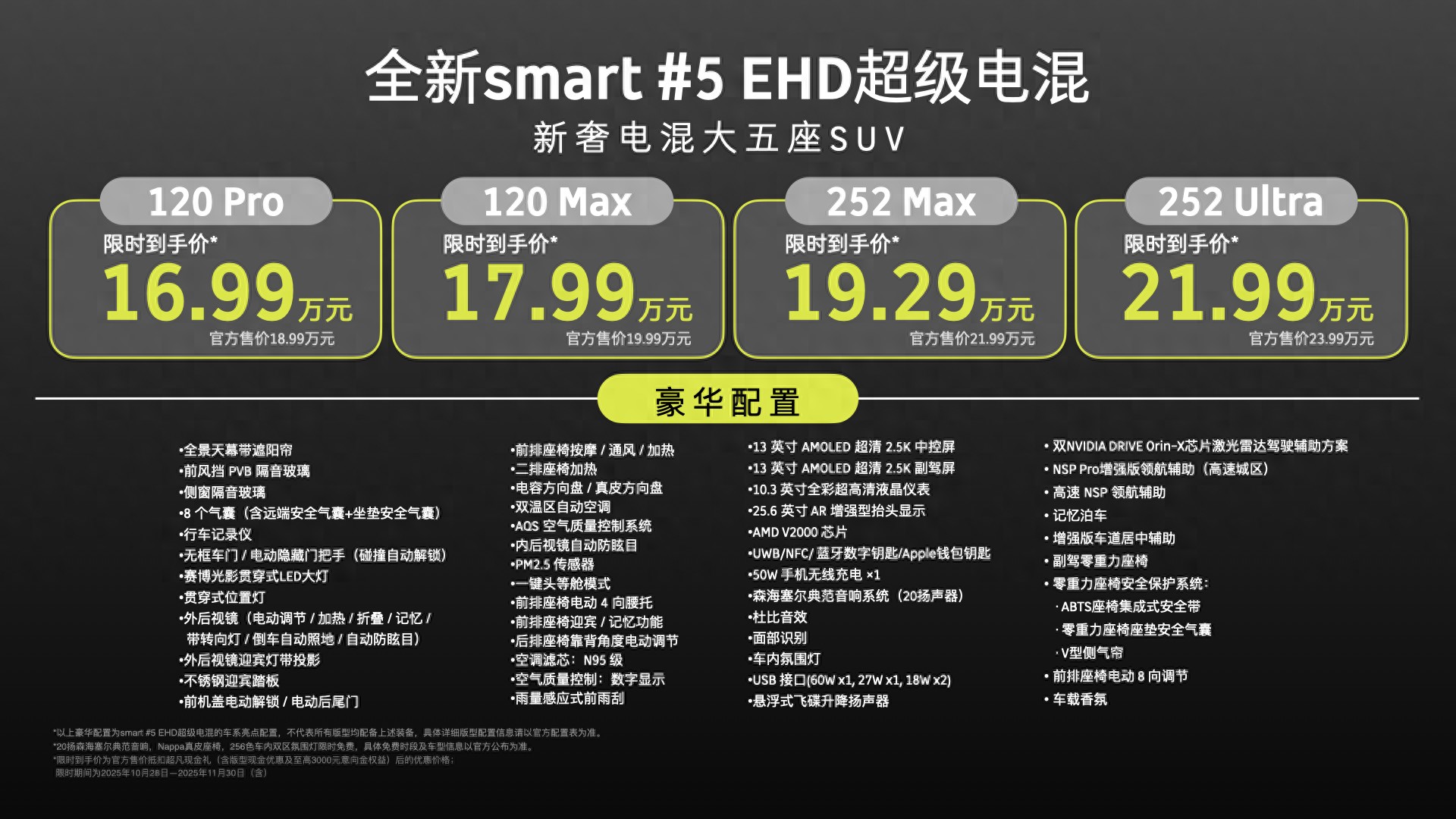 想买豪华混动SUV,可以选全新smart精灵5号超级电混,120+项豪华配置全系标配,入门即顶配。正式上市价格,限时到手价16.99万元起,有四款车型可选,偏城市日常的超级电混 120 Pro,豪华进阶不焦虑的超级电混 120 Max,长途旅行也能说走就走的超级电混 252 Max,以及一步到位的超级电混 252 Ultra。首位车主知名演员李乃文,也在发布会现场跟大家分享了他的用车感受。作为“新奢电混大五座SUV”,smart #5 EHD超级电混,搭载最新一代雷神电混2.0技术,可油可电,CLTC综合续航1615km。亏电油耗仅为4.4L/100km,节油率提升18%。“S级”豪华内饰,首款“兼顾舒适坐姿与安全保护”的零重力座椅、20扬声器森海塞尔音响系统、奔驰同款256色氛围灯,轻奢风走起。同时,得房率高达85%,五人满载也很舒适。625L-1525L可变后备箱与32处储物空间,容纳更多出行装备。科技方面,沉浸式AMD 5屏智能座舱+元戎智驾加持的smart Pilot Assist智能辅助驾驶系统,保证智能化体验。有实用主义的贴心,也有浪漫主义的精致,贴合各种场景,专为需求而来。